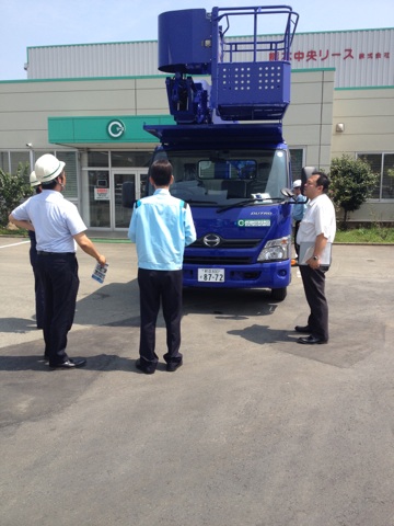 TADANOトラック式高所作業車(AT-220TG)を空港通り営業所に入庫いたしました。本社にて納車の確認・安全祈願後、営業所へ運ばれます。